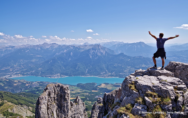Pour l’atteindre, c’est une randonnée de niveau intermédiaire et facilement accessible aux amateurs de marche qui vous attend. La récompense en vaut le détour. Vous surplomberez les 2 branches du lac. Une vue à 360° avec un panorama sans égal, des hauts sommets glaciaires du Parc National des Ecrins jusqu’au géant de Provence, le Ventoux.